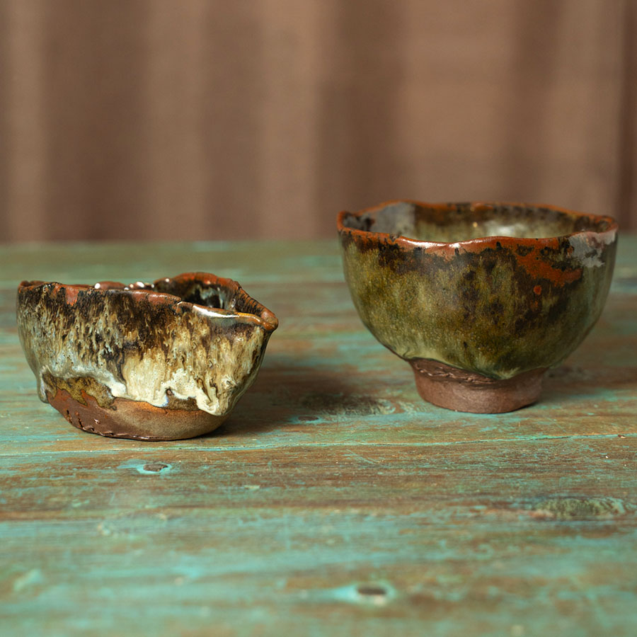 Piezas de gres rojizo muy tostado. Hechas a mano, sin torno. Esmalte hecho con cenizas de madera dura. Cocido a 1300 grados en atmósfera reductora en horno de gas.