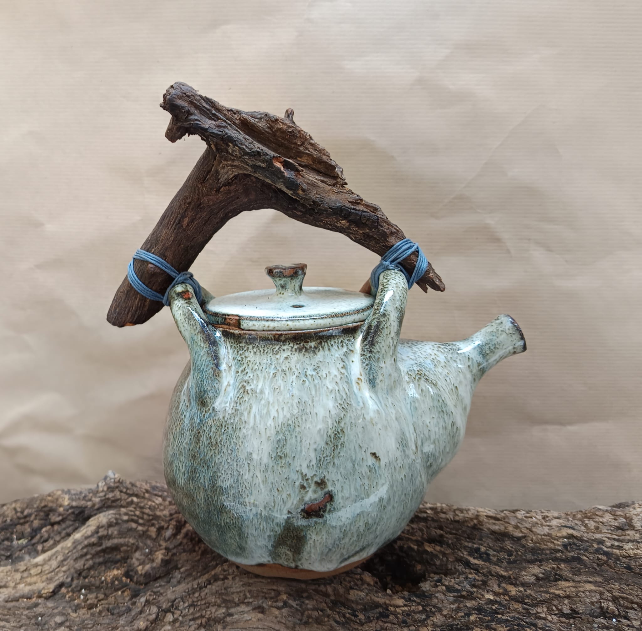 Tetera de gres de esmalte de cenizas de madera dura. Cocida en horno de gas en atmósfera reductora a 1300 grados. Filtro incorporado, Mango de madera natural.